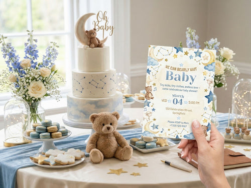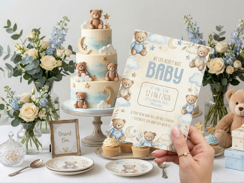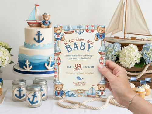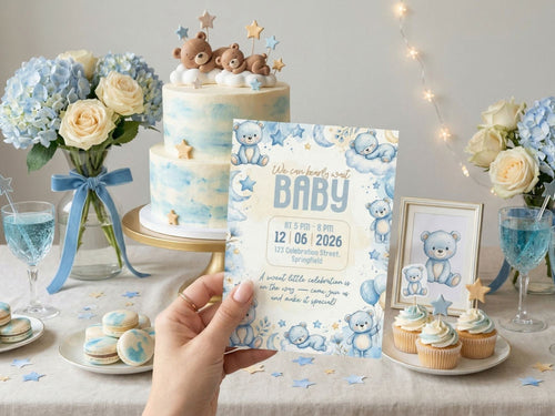 [FREE SAMPLE] Green Baby Car Bear Baby Shower Invitation – Editable Canva Template – Share video mp4 – Instant Download -